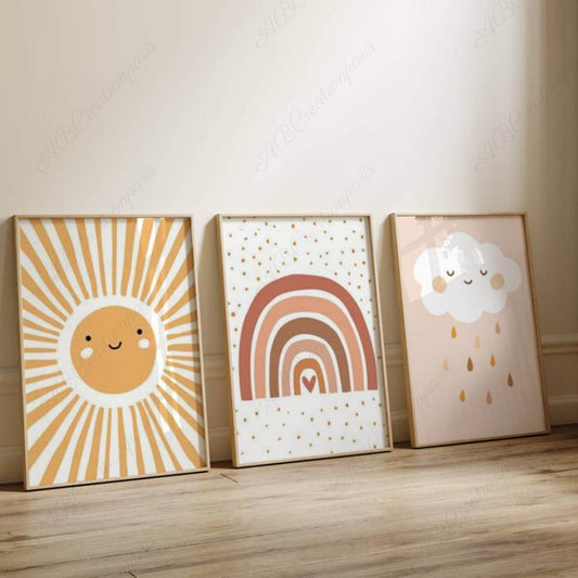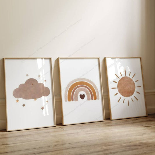 Set 3 affiches Style Boho Décoration Chambre Enfant Affiche de Naissance Arc-en-ciel Terracotta - Arc-en-Ciel Soleil Nuage et Fleurs