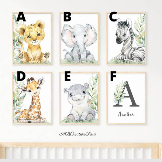 Décoration Chambre Bébé Et Enfant thème Safari - Affiches Avec Prénom Personnalisé, Animaux et Feuillage - Ideal pour Chambre mixte