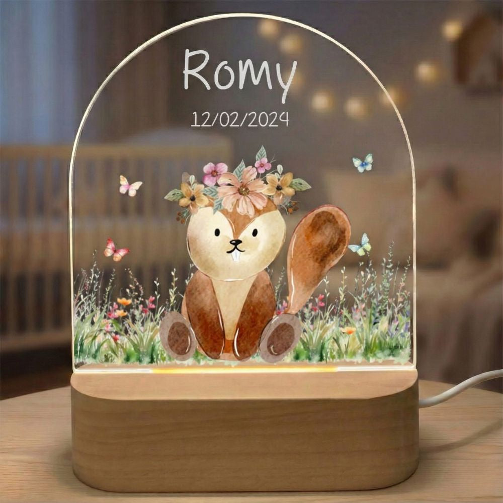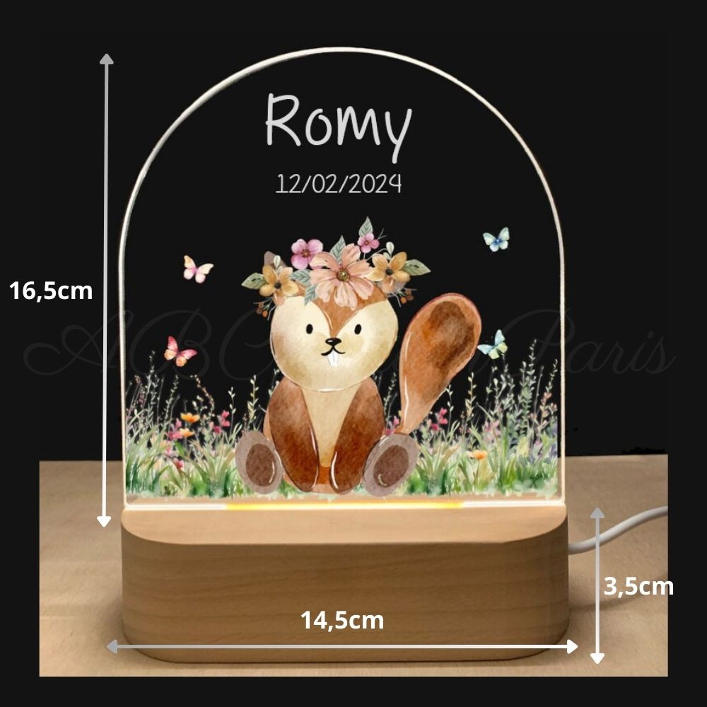 Veilleuse personnalisé avec le prénom et la date de naissance accompagné d'un castor et de mignon papillon !